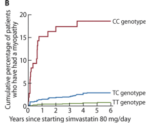 研究表明,每日摄取相同量的辛伐他汀,SLCO1B1纯合突变体内他汀药物浓度明显高于野生型和杂合突变型,而携带前者的患者发生的肌病概率远远大于后者。