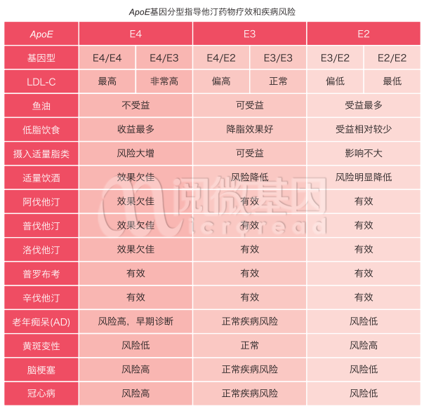 Thompson 2009年研究基因多态性对于他汀降脂疗效影响试验中指出,ApoE基因多态性与降脂疗效有显著相关,且降脂疗效依次为ApoE2/E2 >Apo E2/ E3> ApoE3/E3> ApoE3/E4> ApoE4/E4。