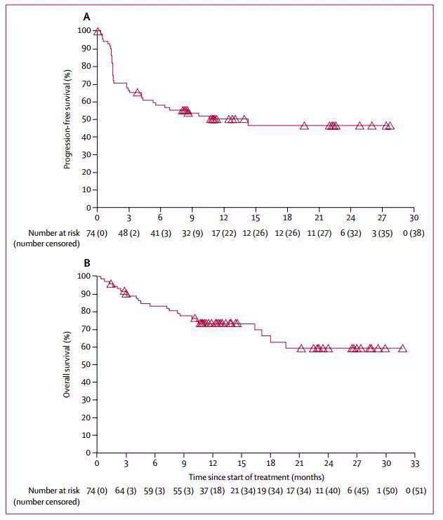 截止2017年1月时,仍有36名(49%)患者仍在接受治疗。23名患者取得了客观缓解,51名患者在接受纳武单抗治疗12周时疾病得到了控制。