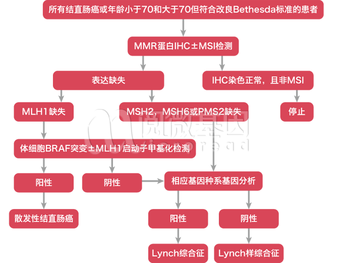 Lynch综合征的定义仍在不断开展,即使修订后的Bethesda指南与家族史不完全匹配,一个人仍可能患有Lynch综合征。NCCN指南建议所有的结直肠癌病人都行MMR或MSI筛查。