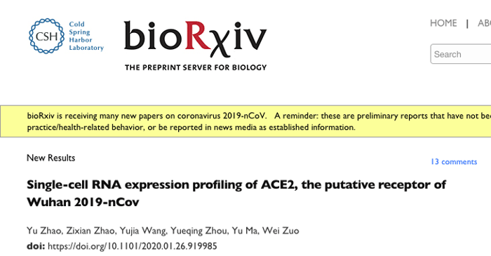 2020年1月26日,同济大学附属东方医院的左为团队在 bioRxiv 上发表文章,其团队基于公开的数据库,分析单细胞测序数据,研究了共计43000多个肺组织细胞[2]。