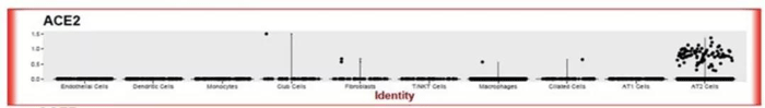 研究结果表明,ACE2受体在肺内一小群II型肺泡上皮细胞(AT2)上集中表达,且这类AT2细胞占所有AT2细胞数量的1%左右。更重要的是,此类AT2细胞除了表达病毒ACE2受体之外,还显示出其他20余个与病毒复制和传播密切相关的基因的高表达,说明此类细胞具有高度可能性是2019-nCov感染的靶细胞。