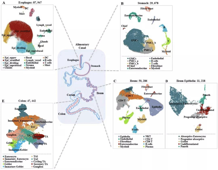 消化系统不同组织的细胞亚型分类图