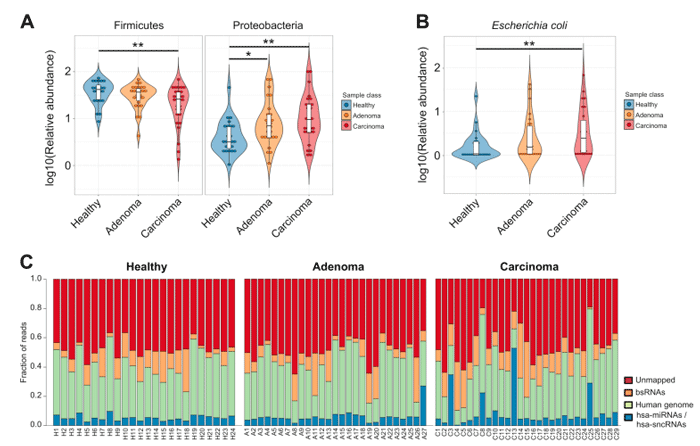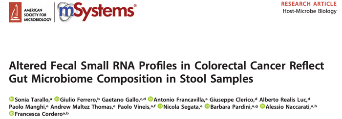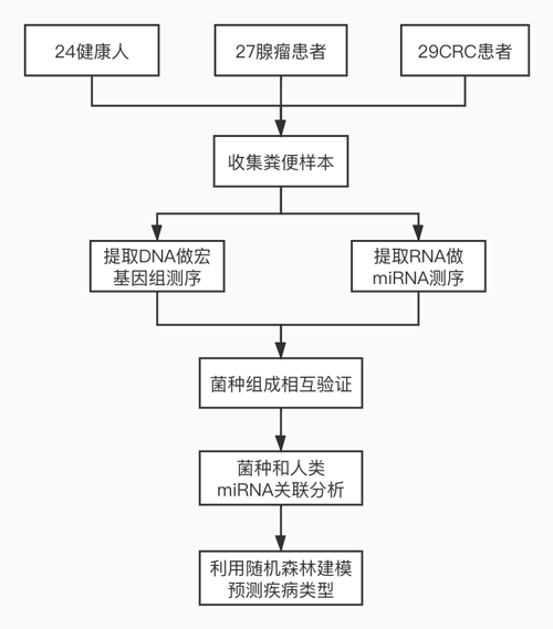 众多研究表明,结直肠癌(CRC)的发生开展与人类小 RNA(hsa-miRNAs)有关,而近年的一些研究发现它们在肠腔中的释放有助于塑造肠道菌群,而细菌小RNA(bsRNA)也可能在致癌作用中发挥作用,但其作用并未被广泛探讨。此研究利用小RNA测序和宏基因组测序的方法对正常人,腺瘤患者以及结直肠癌共80个人进行了研究,分析了人类肠道微生物组小RNA表达与CRC患者肠道中潜在分子相互作用。并提出了一种DNA和RNA标志物的结合方法,它能够根据癌前病变和健康对照准确地对CRC患者进行分类。