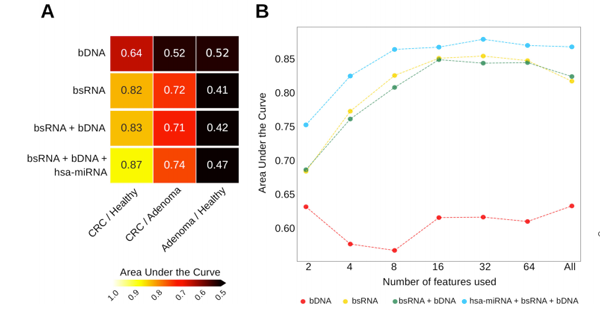 利用宏基因测序和小RNA测序得到的细菌DNA,细菌小RNA,宿主小RNA等单独参数或混合参数构建随机森林模型,发现在综合使用人类和细菌sRNA和细菌DNA的情况下,区分健康对照和结直肠癌的准确性最高,AUC值可达0.87。相反,仅使用微生物DNA图谱对样品进行分类的潜力较低。