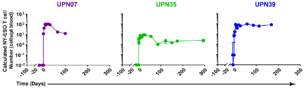 三名患者回输后血液中NYCE细胞量,横坐标为天数