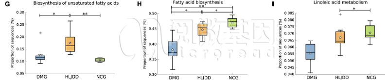 第一时间,采用16S测序法对正常对照组(NCG)、T2DM模型组(DMG)和HLJDD处理的2型糖尿病组(HLJDD)的大鼠粪便标本中的细菌群落进行分析, 并用PICRUSt工具预测其差异菌种功能。