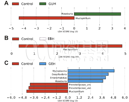 继续用PICRUSt工具对16S测序数据进行功能和代谢通路预测,结果显示,GEH组的碳固定、能量代谢、氨基酸代谢和醌类合成代谢途径相对减弱,而酸转移酶系统、磷酸戊糖途径和脂类代谢通路相对升高,而这些变化主要来自于Mycoplasma菌属丰度的改变。