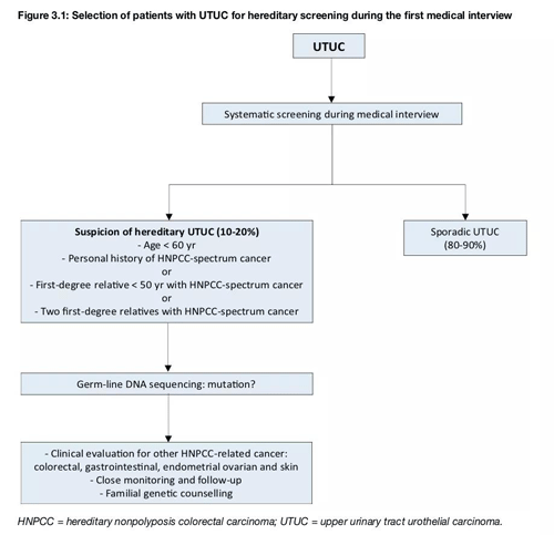 EAU指南建议对于小于60岁、有个人林奇谱系肿瘤史或家族史等高危因素的UTUC患者进行LS筛查。而在Ju等人的研究中,所有dMMR-UTUC患者的年龄都在60岁以上,几乎都吸烟,且并不是所有患者都有LS相关的癌症个人史,家庭成员的癌症史常缺乏或不完整,组织学特征无明显差异。鉴于UTUC相对少见但在LS患者中有较高的发病率,所以建议诊断指南应推荐对所有UTUC患者进行MMR /MSI检测[2]。