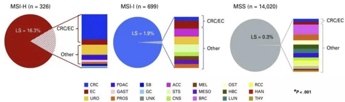 MSI-H/dMMR可预测比现在认可的肿瘤范围更广的LS,因而,无论其肿瘤类型及家族史,具有MSI-H表型的任何肿瘤,均应进行LS相关基因生殖系遗传评估。