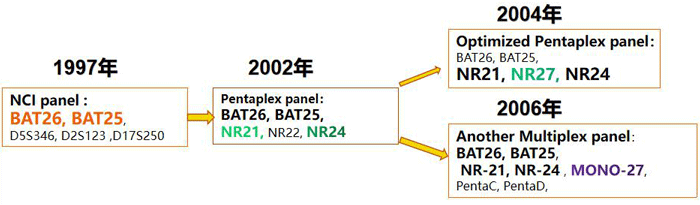早在1997年,在美国国家癌症研究所(National Cancer Institute,NCI)提出了5个微卫星的评价系统,包括:BAT-25,BAT-26,D5S346,D2S123,D17S250,其中D5S346, D2S123, D17S250为双核苷酸微卫星。