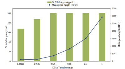 ■ 灵敏度高:DNA模板含量低于0.125ng时,仍可得到完整分型,以及有效的基因座信息。