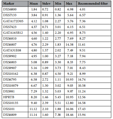 Stutter产物会影响对结果的解释,无法判定一个小峰是含量较少的次要产物,还是一个相邻等位基因峰的Stutter产物。从357个样本中计算出每个基因座的Stutter百分比的均值和标准差,如下表所示,表明该体系中每个位点的Stutter百分比都较低,不会影响对检测结果的解释。