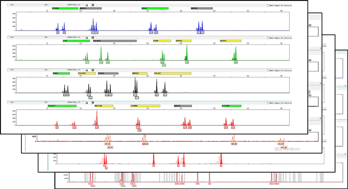 k8凯发基因的核心技术平台——“中通量荧光PCR-毛细管电泳平台”对中小Panel(5~40位点)检测具有高度优势,搭配不同通量基因分析仪的自动进样功能,日检测样本量最高可达4500份,相当于单日完成22,500~180,000个标记检测;同时对样本质量的要求低,能满足多类型样本上机检测,包含口腔拭子、毛囊、血液、血痕/干血斑、精液等,并支持血痕/干血斑样本免提取直接扩增。产物长度在500bp范围内可实现单碱基分辨率,检测结果下机数据文件导入分析软件,分型结果一目了然,实验结果准确可靠。
