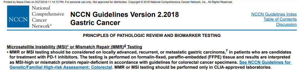在临床实际工作上,自2017年5月FDA加速批准了PD-1抑制剂派姆单抗(Pembrolizumab,商品名Keytruda,俗称K药)应用于具有MSI-H/dMMR特征的不可切除/转移性实体瘤成人和儿童患者以来,MSI/MMR检测已经写进众多实体肿瘤2018NCCN临床实践指南中。