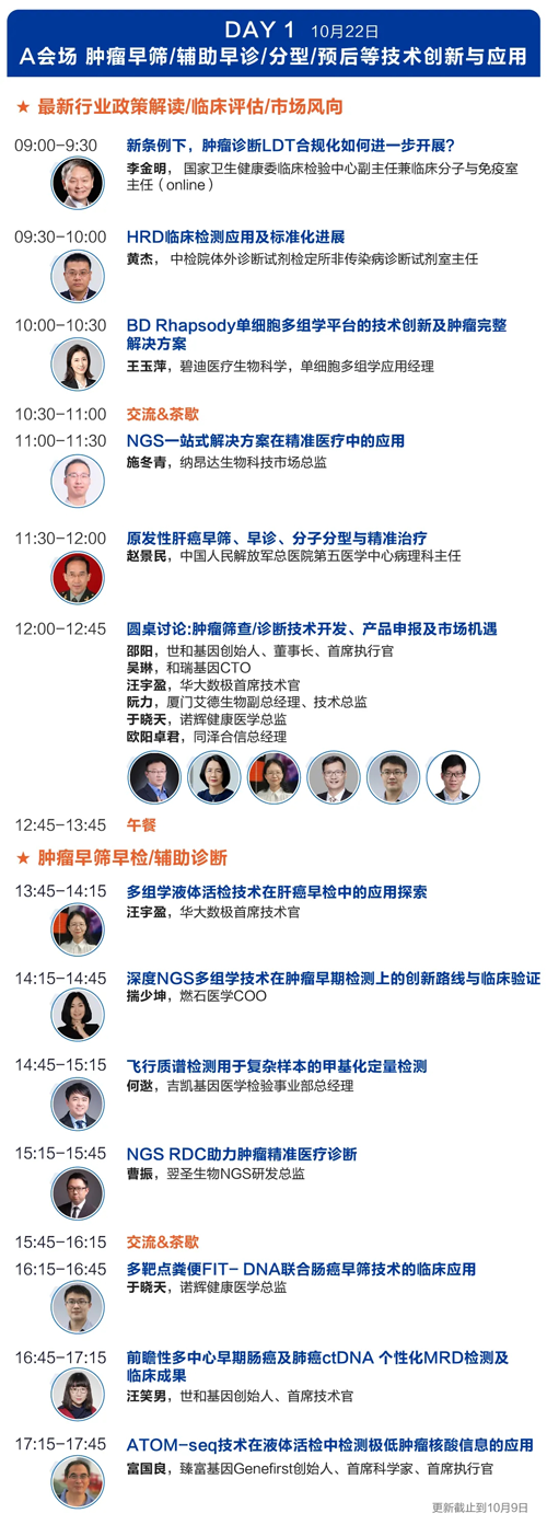 为期两天的会议,共设置了肿瘤早筛/辅助早诊/分型/预后等技术创新与应用、肿瘤创新药物疗法及伴随诊断精准开发转化应用两大专场。会议议题囊括最新行业政策与市场风向解读、如何进一步强化液态活检等肿瘤筛查技术、如何更精准的开发HRD/MRD/MSI等肿瘤分型/预后检测应用、如何深度挖掘生物标志物在诊断、药物开发及用药价值,推进基因检测/伴随诊断/标志物指导下的精准靶向/免疫治疗的开发与转化等。