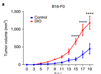 既然T细胞变弱了,这个环境应该是更适合肿瘤生长了。果然,在肥胖小鼠中,黑色素瘤和乳腺癌明显生长得更快。研究者做了进一步分析之后,发现肥胖对肿瘤的促进作用还可以分为两个部分,肥胖的直接影响和免疫抑制的间接影响。