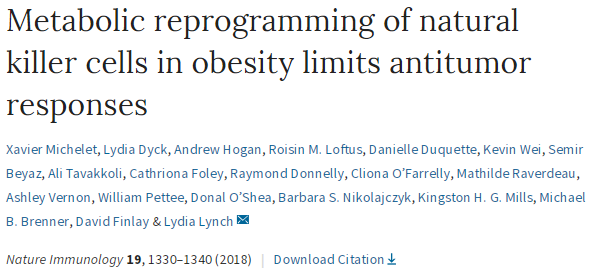 近期《自然免疫学》上也刊登了一篇主题类似的研究,哈佛大学研究者发现肥胖会顺利获得抑制自然杀伤细胞(NK细胞)来削弱抗肿瘤能力。