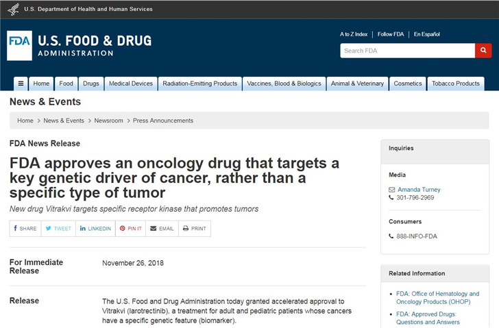 FDA加速批准泛癌种靶向药 Vitrakvi(拉罗替尼)上市,是否为“广谱神药”?