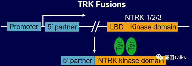 其中NTRK基因的3'部分发生了包含催化酪氨酸激酶域、与相关基因5'部分的内框融合,驱动基因表达,促进蛋白二聚体化等变化,这与ALK和ROS1基因融合的致癌原理类似。