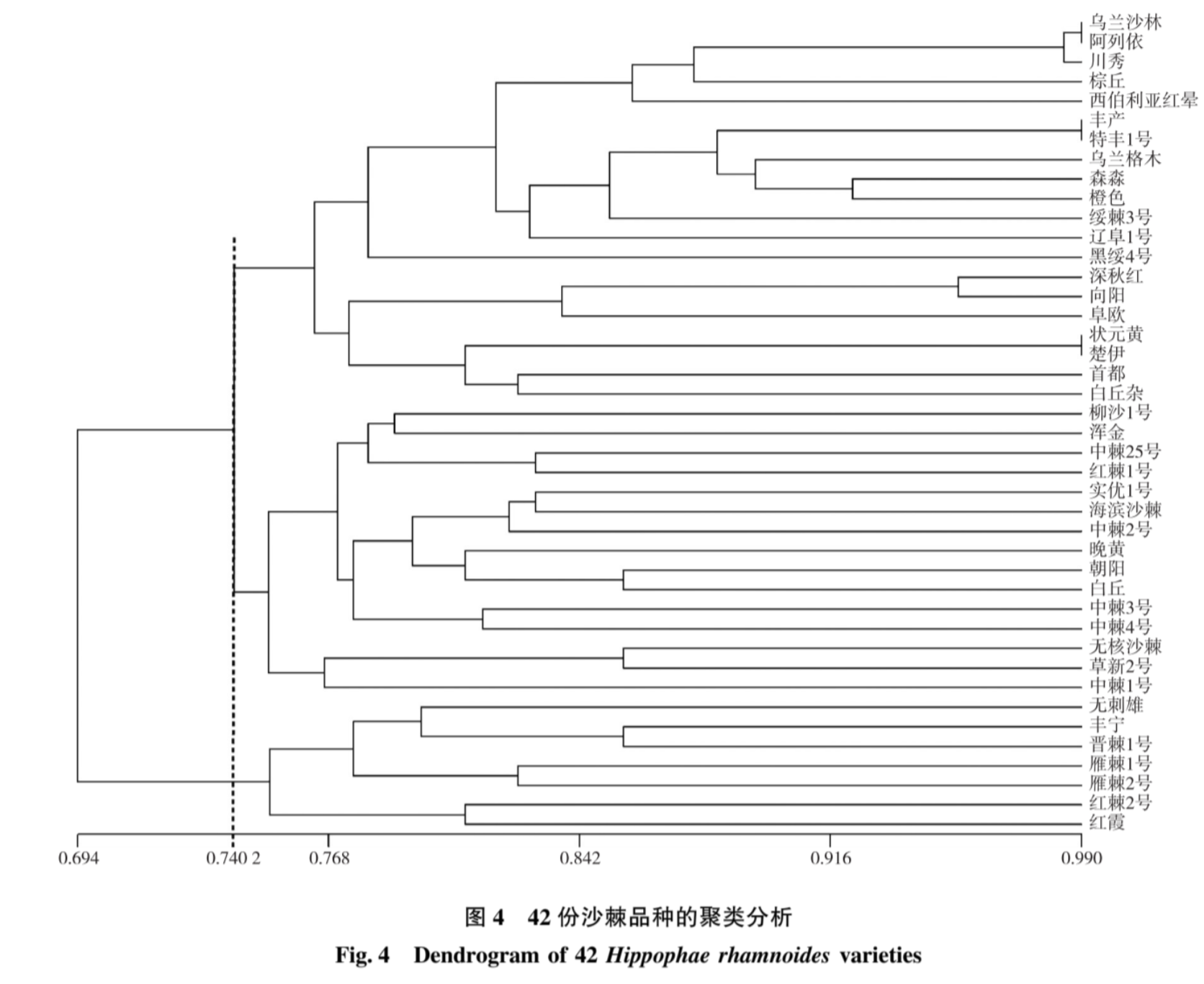 顺利获得UPGMA聚类分析,42份沙棘品种被科学划分为3大组群,清晰揭示品种间遗传相似性。例如,“乌兰格木”与杂交后代“中棘系列”聚为一支,为育种方向给予分子依据。